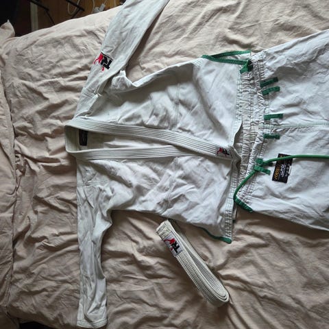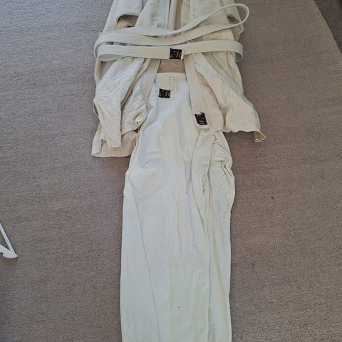 2 st fina Judo kläder med storlek 150 och 2 st gula bälten, 1 st röd bälte och 1 st vitt bälte.