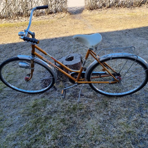 Crescent cykel för kvinna med ramstorlek S och 24" hjul. Utrustad med pakethållare bak, skärmar och framlykta. Klassisk modell med upprätt sittställning som passar för vardagscykling och kortare turer. Sadel och styre är anpassade för damcykel. Färgen är brun med kromade detaljer.