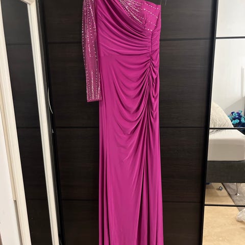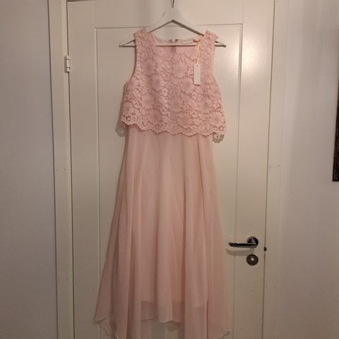 klänning i storlek S för dam. Klänningen är blå och tillverkad i polyester. Modellen har trekvartsärmar, fyrkantig halsringning och flera våder med volanglager framtill. Dragkedja bak för stängning. Längd och vidd framgår delvis av måttbandet på bilderna. Passar som enkel vardags- eller festklänning beroende på styling. Helt oanvänd! Säljer pga oanvänd