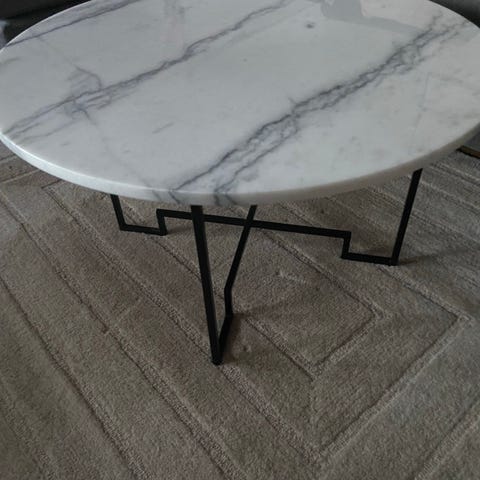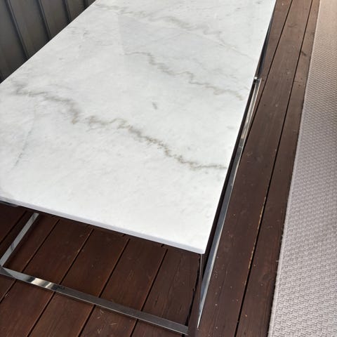 Säljer ett riktigt fint soffbord med marmorerad glasskiva och stilren metallram. I bra skick och redo för ett nytt hem 😊