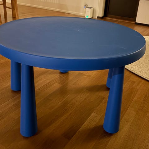 Jag har ett runt bord för barn, röd bordsskiva och blå stålben. Står stabilt och känns stadigt. Diametern är ca 70 cm och höjden 50cm så de funkar fint att ha IKEAs barnstolar till.