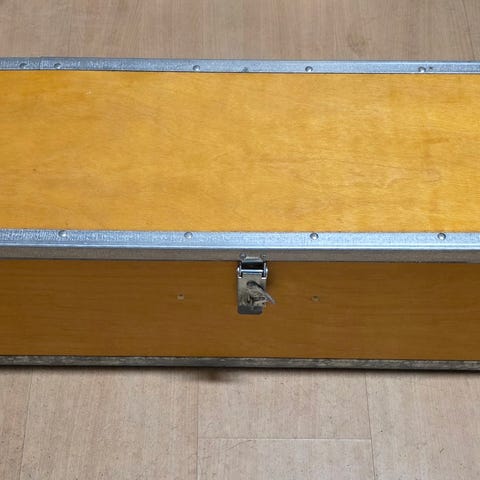 Detta är en robust verktygslåda i trä med metallförstärkta kanter, sannolikt av en modell liknande en Ply-Pack.