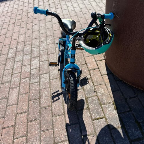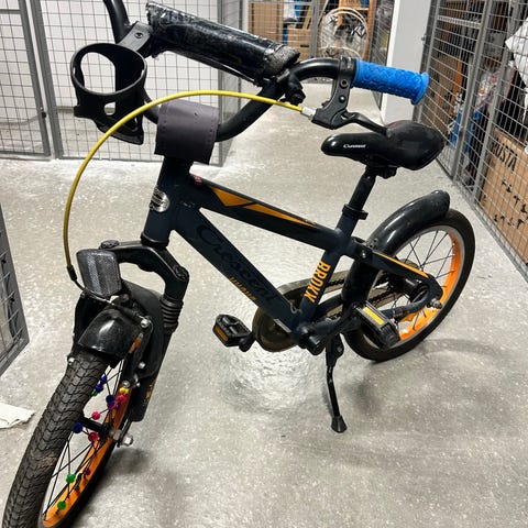 Säljer en tuff barncykel från BTwin (Decathlon), Pirate-modell i svart med turkosa detaljer. Perfekt för barn som håller på att lära sig cykla eller nyligen lärt sig.