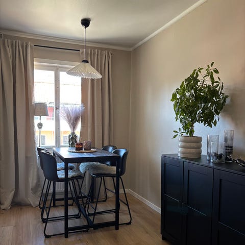 Barbord och 4 st barstolar i vit högglans i fint använt skick, tar lite plats och passar utmärkt i mindre utrymmen. Bordet är höj- sänkbart. Bordskivan är lätt skadad efter flytt och vissa stolar har någon liten fläck/repa. Vill bli av med matgruppwn så fort som möjligt.