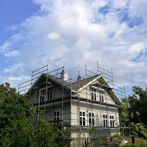 Aluminum lätt ställning med hjul, 1 Platta och ca 4-5 stolpar, jag har använt den till fasadmålning och det har funkat väldigt bra. Vet inte exakt höjd men går nog på 6m arbetshöjd eller mer, Finns i Skövde