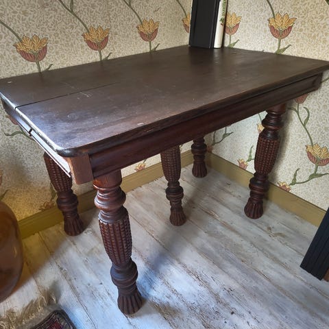 Mörkbrunt soffbord med två sidobord. På bild syns bara det ena sidobordet. Sidoborden som nyskick, det större bordet har några fläckar som kan döljas med en duk.