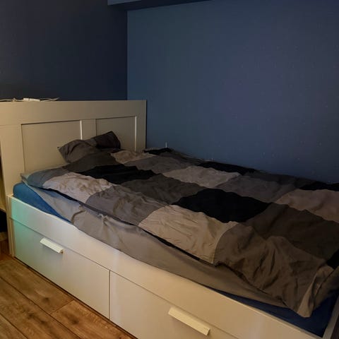 IKEA säng med förvaring i vit färg. Sängen har inbyggda lådor undertill som ger extra förvaringsutrymme för till exempel sängkläder, kläder eller andra textilier. Passar i sovrum, gästrum eller mindre utrymmen där extra förvaring är praktisk. Madrass av hög kvalitet ingår.