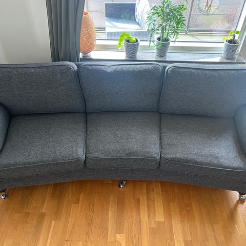 Mörkgrå 3-sitssoffa i svängd Howardmodell i fint skick. Bredd 250 cm, djup 100 cm och höjd 75 cm. Mått är ungefärliga. Kuddarna har dunstoppning.