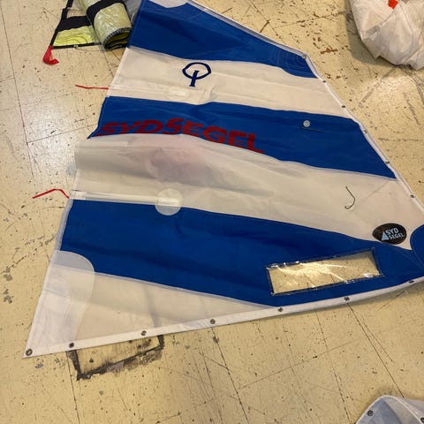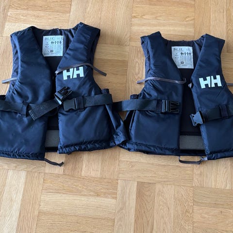 Flytväst i flerfärgad design med rött, vitt och marinblått tyg. Modellen är ärmlös med dragkedja framtill och justerbara remmar i sidorna för bättre passform. Passar för vuxna vid exempelvis båtliv och andra vattenaktiviteter. Materialet är ett syntetiskt tyg anpassat för användning i vattenmiljöer. Flera likadana flytvästar finns på bilderna, vilket kan tyda på att flera storlekar eller exemplar finns tillgängliga.