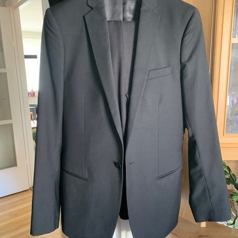 H&M kostym för herr i storlek 164 CA 13-14 Kostymen är svart och tillverkad i polyester. Består av kavaj skjorta och byxor Passar exempelvis till vardag, arbete eller mer formella tillfällen där en enkel, svart kostym önskas. Slips ingår ej.