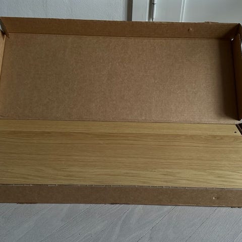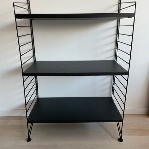 Stringhylla med två sektioner och totalt 3 gavlar och 2 hyllplan vardera. Troligen i ek. String original och märkning finns.
