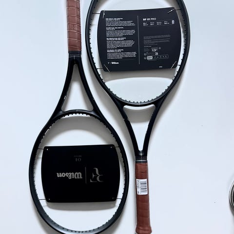 2 racketar, ett helt nytt racket, det andra är bara spelat med två gånger. Vikt: 305 gram, huvudstorlek 97, balans 310 mm, strängmönster 16/19, greppstorlek 3. Nypris 2400:-.