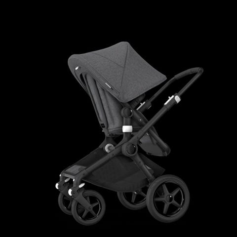 Bugaboo barnvagn med sittdel i mörkblå textil och ljus insida. Sitt och liggdel. Modellen är Fox 2 med massa möjligheter till att justera det mesta. Punkteringarna däck.