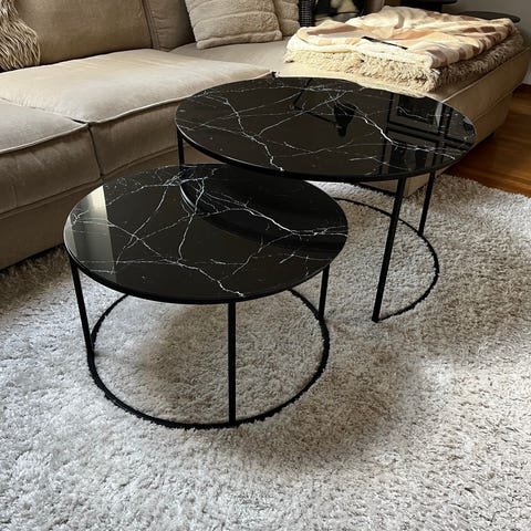 Jotex soffbord sats i svart utförande. Består av två runda bord i olika höjd som kan användas tillsammans eller var för sig. Bordsskivorna är släta med lätt trästruktur och benen är raka med kryss-stag för stabilitet. Passar som soffbord eller sidobord i vardagsrum eller andra sällskapsytor.