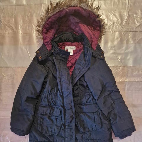 Jacka, parkas mörkblå med rosa insida strlk 92, H&M (använd, namnad, fint skick).