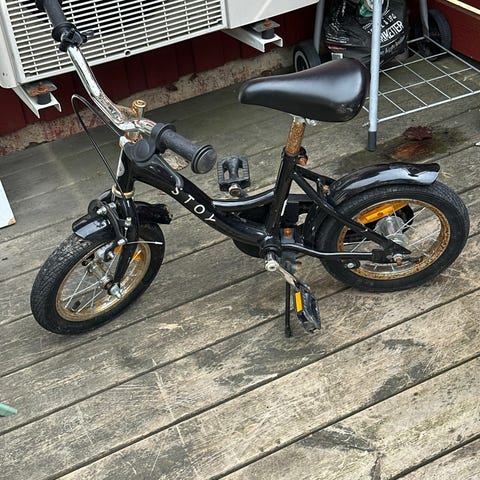Stoy 12 tum barncykel. Bra skick, men finns lite skavanker/slitage efter användning, dock fullt funktionellt skick. Medföljer även oanvända stödhjul. Finns i Aspeboda. Kan ev tas till Falun och Avesta i samband med arbete.