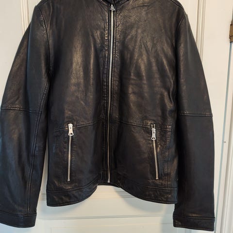 Säljer en riktigt snygg och minimalistisk skinnjacka i 100% lammläder. Jackan är i nästan nyskick och väldigt sparsamt använd – perfekt för dig som vill ha en premium-look utan att betala nypris.