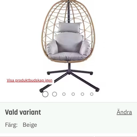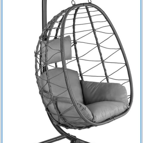 Hängstol för uteplats eller balkong i svart rottingimitation med metallstativ. Stolen har en äggformad korg med ribbad konstruktion och medföljande mörka dynor för sits och rygg. Passar för användning utomhus på altan, trädgård eller balkong som sittplats eller avkopplingsstol.