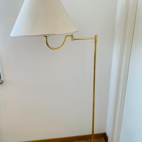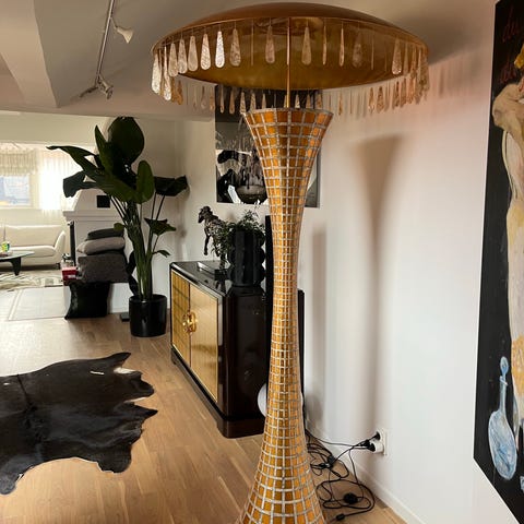 Säljer en unik och ovanlig golvlampa i klassisk art déco-stil från 1970-talet. Lampan är tillverkad i mässingspläterat stål med stilrena svarta detaljer som ger ett exklusivt och tidlöst uttryck.