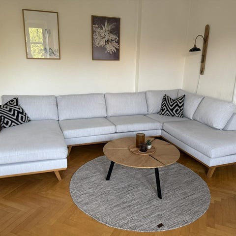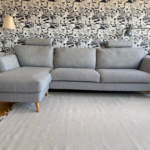 Soffan har schäslongdel som går att placera på vänster eller höger sidan. Raka armstöd. Rygg- och sittdynor är tuftade med rutmönster. Ben i ljust trä. Passar som sittmöbel i vardagsrum eller liknande utrymme.
