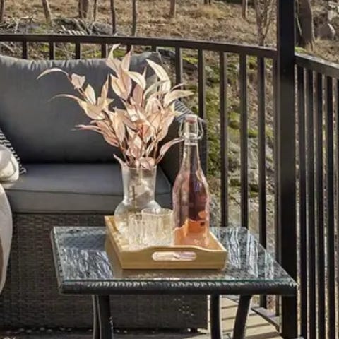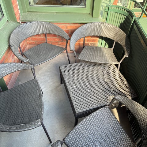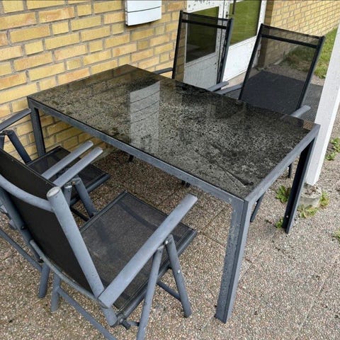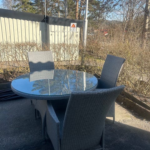 Bordsskivan är i glas med oval konstrotting med metallstomme. Passar för uteplats, balkong eller altan.