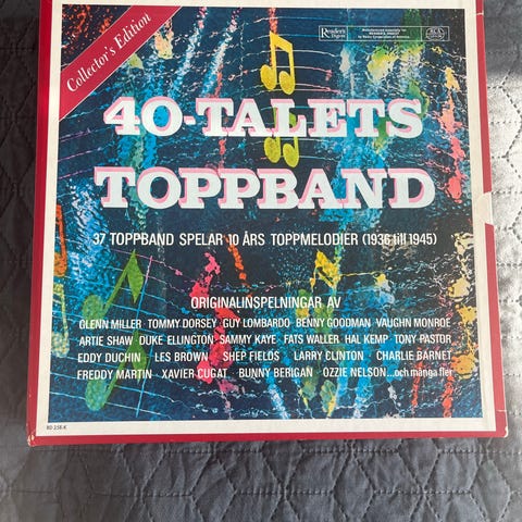 "40-talets toppband" samlingsbox med vinylskivor. Boxen innehåller inspelningar med olika orkestrar och artister som spelar toppmelodier från 1940-talet (1939–1949). Medföljande häften med information om låtar och medverkande artister ingår. Passar för den som är intresserad av swing, storband och populärmusik från 40-talet.