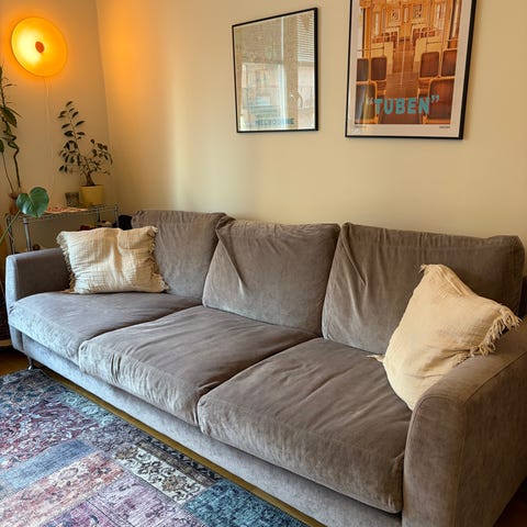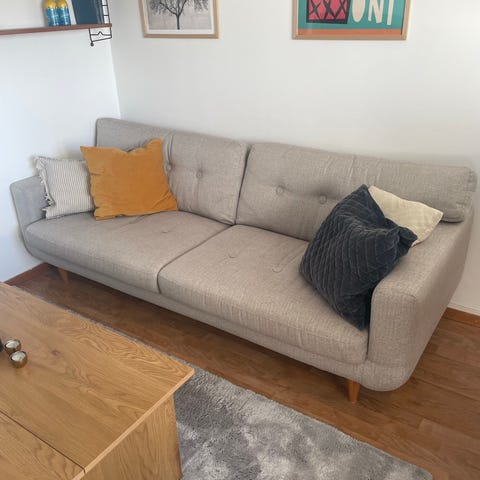 Grå 3-sitssoffa från Burhéns med svarta träben. Bra skick, inga fläckar. Något solblekt. Avtagbar klädsel.