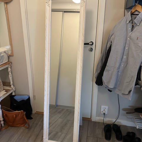 IKEA spegel i vit ram. Rektangulär väggspegel som passar i exempelvis hall, sovrum eller vardagsrum. Kan användas både som praktisk helkroppsspegel och som inredningsdetalj för att ge rummet en känsla av rymd.