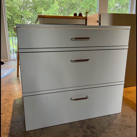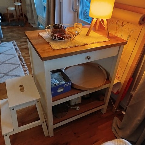 Fin köksö, några mindre skavanker efter flytt (se bilder) med lite färgskav och ytliga repor i toppskivan.