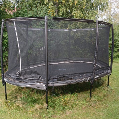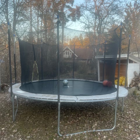 Studsmatta från North Trampoline modell större. Själva mattan är i gott skick. Skyddet runt har en del skavanker som syns i bild men fungerande. Skyddsnätet finns ej kvar men går köpa till som reservdelar hos North Trampoline.