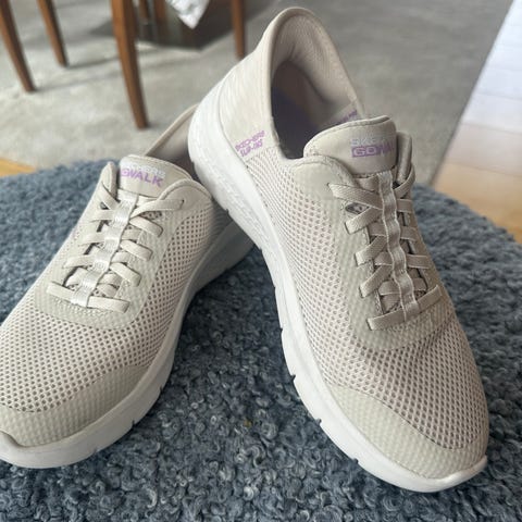 Skechers Arch Fit sneakers i storlek 43. Modellen har ovandel i grått meshmaterial med snörning och ventilerande perforeringar. Sulan är vit med Arch Fit-stöd för hålfoten. Skorna är utformade för vardagsbruk och promenader, med mjuk vaddering runt häl och plös för ökad komfort.