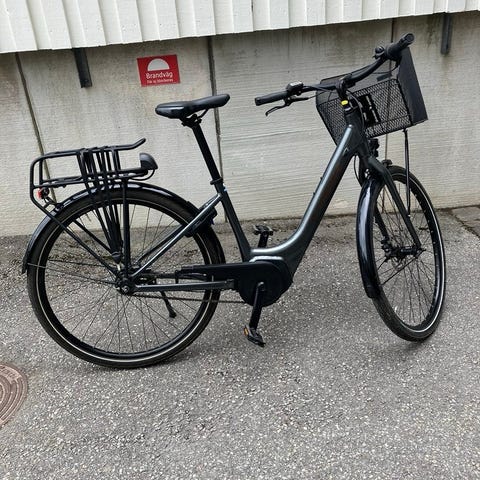 Elcykel för kvinna med ramstorlek M och 26" hjul. Utrustad med mittmonterad motor, display på styret och batteri placerat på ramen. Cykeln har pakethållare bak, skärmar och komfortsadel. Passar för vardagscykling och pendling i stadsmiljö.