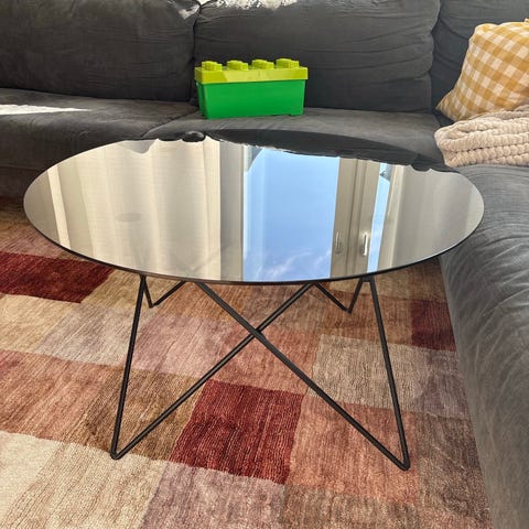 Soffbord Yoko från Mio med runt glasskiva och svart underrede i metall.