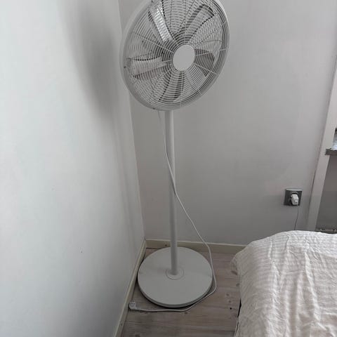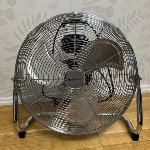 Golvfläkt i metall i silverfärg. Fläkten har rund front- och bakgaller i metall samt stabilt stativ med båge som står direkt på golvet. Lutningsvinkel kan justeras via sidofästen. Baksidan har motorhus med reglage för 3 olika hastigheter.