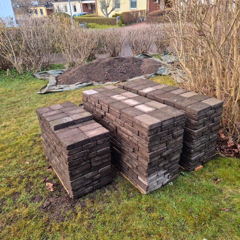 Stenarna är staplade på lastpallar och lämpar sig för exempelvis uteplats, gångar eller uppfart. Uppskattat antal är ca400st. 25kr/st
