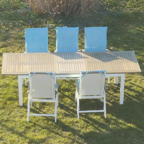 Fint Teakbord och fint set med utesoffa och fåtölj med dynor. Köpt på Ellos. Trädgårdsmöbler i väderbeständig polypropylen med pulverlackerade ben i metall. Dynor med klädsel i polyester och skumfyllning. Sits- och ryggdynor ingår.