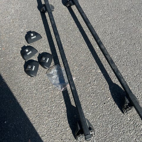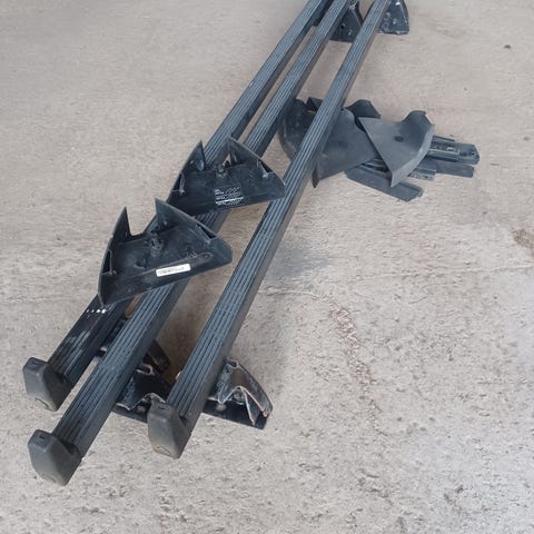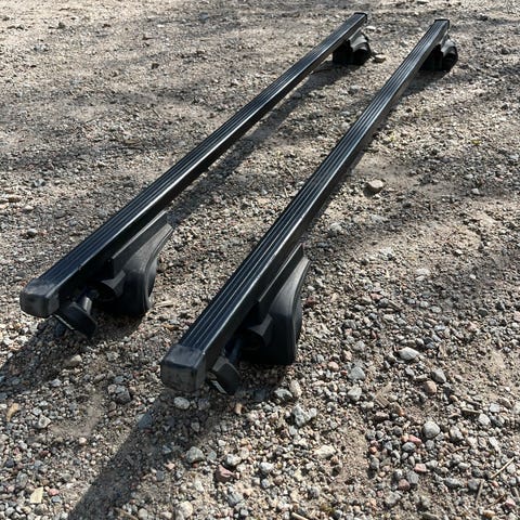 Takräcken i svart färg. Två längsgående räcken med infästningar i ändarna. Passar bil med rätt typ av fästen för denna modell av takräcke. Materialet är troligen metall med plastdetaljer baserat på utseendet på bilderna. Lämpliga för montering av till exempel lastbågar eller takbox, förutsatt kompatibilitet med bilens tak och övriga tillbehör.