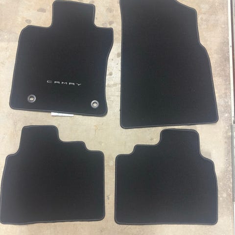 Svarta bilmattor i tyg. Uppsättning med fyra mattor i olika storlekar, anpassade för fram- och baksäte i personbil. Mattorna har utskärningar och fästhål för att passa bilens golv och ge skydd mot smuts och slitage.