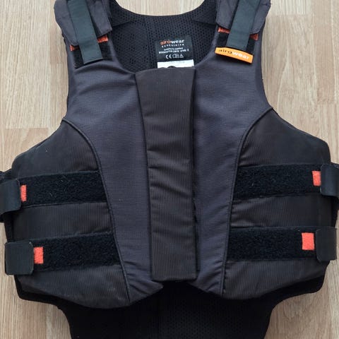 Justerbara sidoremmar och midjerem med spänne framtill. Tillverkat i slitstark polyester och bomull med stötdämpande material för skydd av överkroppen vid ridning och liknande aktiviteter.