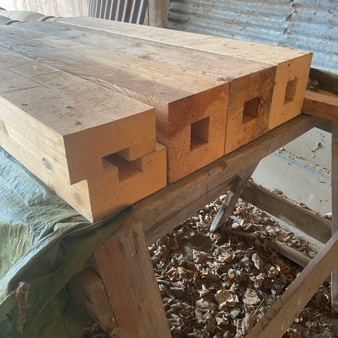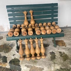Träpelare/stolpe med svarvad överdel och fyrkantig nederdel 195x195 mm. Målad i röd kulör. Passar exempelvis som stolpe till veranda, altan eller räcke. Öppen ihålig konstruktion enligt bilderna. 5 st säljes tillsammans i befintligt skick.