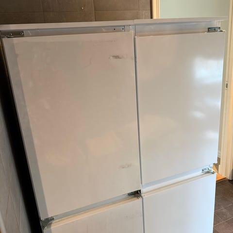 Samsung kombiskåp kyl och frys i vit färg. Skåpet har kyl ovanför och frys nedtill med flera hyllor, dörrfack och utdragslådor för förvaring av matvaror. Passar för användning i kök eller som extra kyl- och frysförvaring i exempelvis förråd eller grovkök.