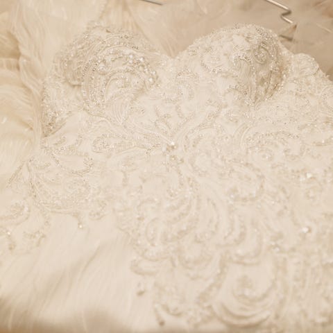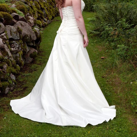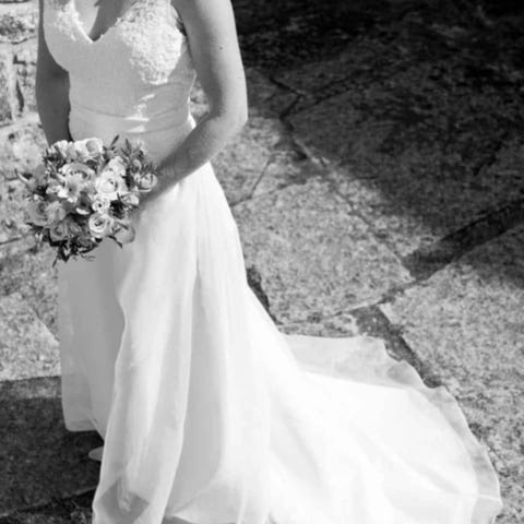 Klassisk off white halterneck med mönster på liv och nedtill på kjol/släp. Inköpt och använd en gång, 2010. Nypris drygt 6 000 kr. Måttsydd till ca 170 cm lång och 65 kg (normalt S/M-storlek). Kemtvättad. Lätt fläckad på släpet (se bild) men i övrigt i mycket bra skick.