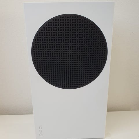 Microsoft Xbox Series S spelkonsol i vit färg. Konsolen är en digital modell i Xbox Series-familjen, avsedd för spel, streaming och appar. På bilderna syns tillhörande kablar samt en handkontroll från Razer anpassad för Xbox. Konsolen ansluts till tv eller skärm via HDMI och strömförsörjs med nätkabel. Lagring, intern hårdvara och övriga specifikationer följer standard för Xbox Series S-modellen.