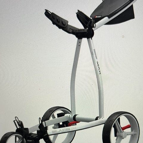 Motocaddy elektrisk golfvagn med tre hjul och hopfällbar konstruktion. Vagnen har handtag med reglage, scorekorthållare och paraplyhållare samt instruktionshäfte.
