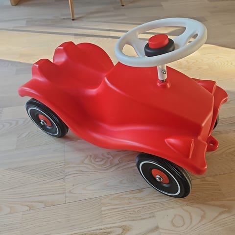 Gåbil i retrostil utformad som en bil för barn. Modellen har kaross i silverfärg, svart sits och svartfärgade hjul med ekrade fälgar. På fronten finns en tryckt siffra 1. Bilen manövreras med ratt och drivs genom att barnet går eller sparkar sig fram med fötterna mot golvet. Lämplig som leksak inomhus eller på släta underlag.