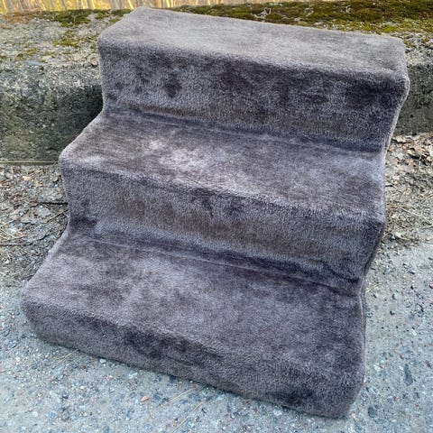 Trappa för husdjur med grått tyg. Består av flera steg med mjuk, klädd yta som ger bra grepp för djuret. Passar exempelvis för att underlätta för hund eller katt att ta sig upp i soffa, säng eller annan högre möbel. Ytan verkar vara i ett mjukt textilmaterial som är behagligt för tassarna. Lämplig för inomhusbruk.