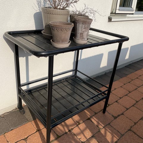 Serveringsvagn för utomhusbruk med två hyllplan. Ovansida och underhylla i grått ribbat material och stomme i vit metall. Vagnen har två fasta ben och två hjul för enkel förflyttning på balkong eller uteplats. Passar som avlastningsbord, planteringsbord eller serveringsbord vid matplats utomhus.