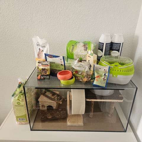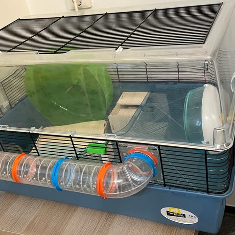 Smådjursbur med underdel i blå plast och genomskinligt plastlock. Buren har en frontmonterad genomskinlig plasttunnel med orange detaljer samt galler upptill för ventilation. Invändigt finns en liten hylla och hus i plast. Lämplig för mindre sällskapsdjur som till exempel hamster eller andra små gnagare. Passar för inomhusbruk.