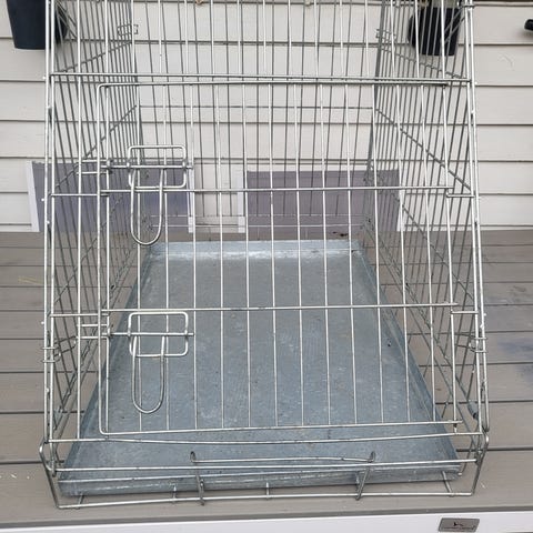 Hundbur i plast med metallgaller framtill och på sidorna. Överdel i beige och underdel i grön plast. Buren har bärhandtag upptill och låsbar gallerdörr framtill. Lämplig för transport av hund eller annat husdjur. Hämtas i Kälvesta