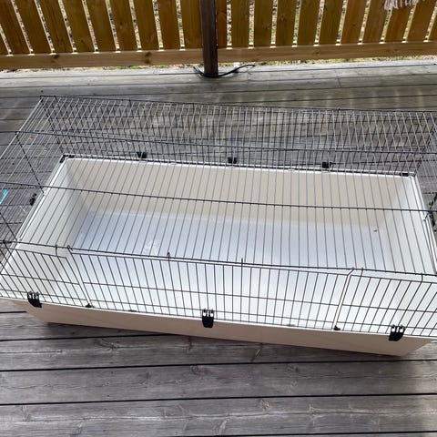 Smådjurshage bur med galler och plastbotten i grå färg. Burens väggar består av metallgaller och en hög plastkant runt om som hjälper till att hålla strö och spån inne. Överdelen har öppningar upptill för enkel åtkomst vid utfodring och rengöring. Passar för mindre sällskapsdjur som exempelvis kanin eller marsvin, beroende på djurets storlek och behov. Burens konstruktion gör den lämplig att placera inomhus på plan yta.